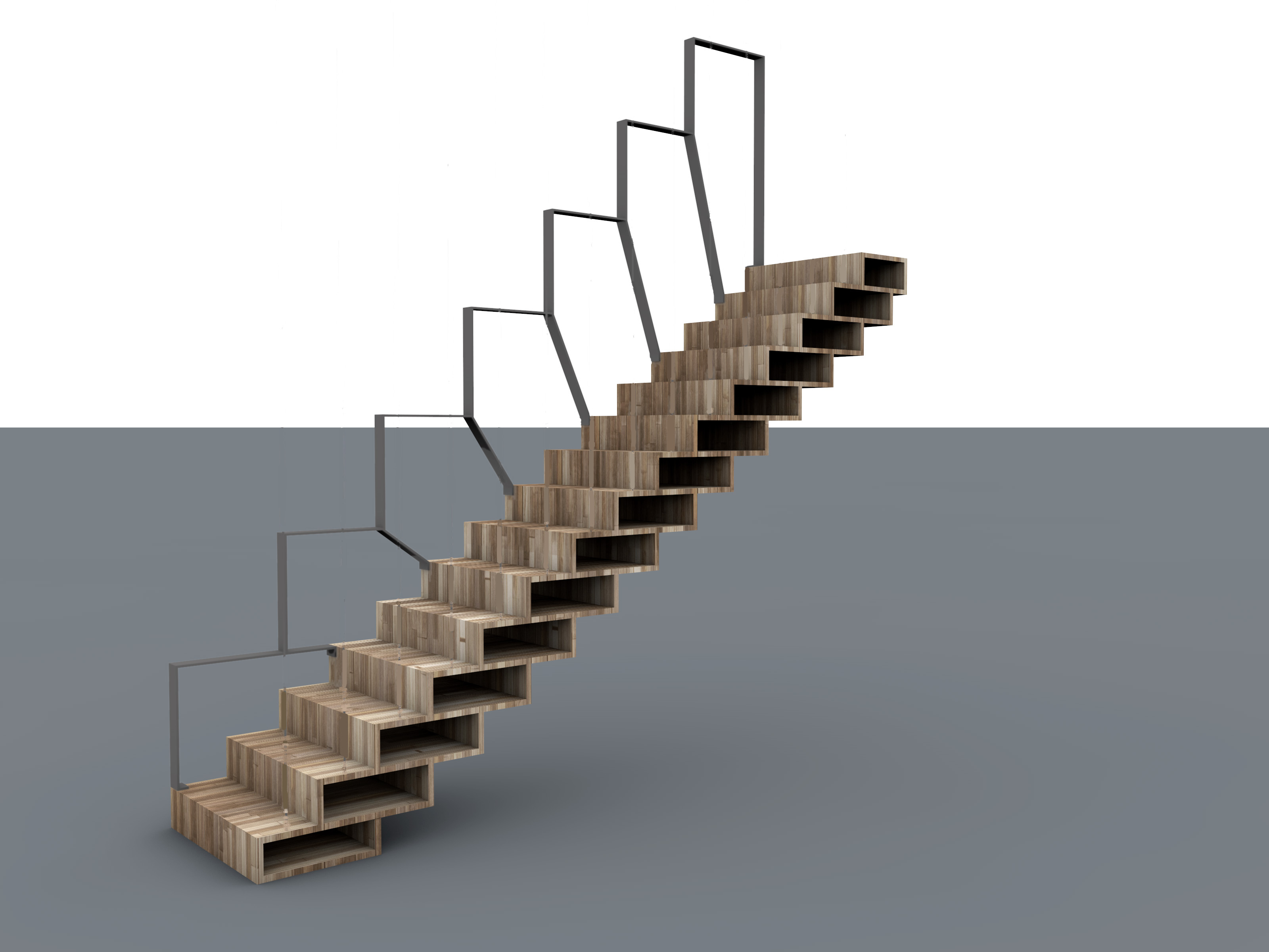 Vous monterez à l'étage par un escalier au design original et contemporain, constitué de boîtes en bois massif qui en font à la fois un objet d'art, de rangement et accessoirement un escalier...